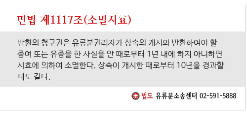 À§ÀÇ Ã¹ ¹øÂ° ±×¸²À» º¸¸é, »ç¸ÁÀϷκÎÅÍ 10³â À̳»¿¡´Â À¯·ùºÐ¹Ýȯû±¸¼Ò¼ÛÀÌ °¡´ÉÇÏ°í ±× ÀÌÈÄ¿¡´Â ºÒ°¡´ÉÇÕ´Ï´Ù. ±×¸®°í µÎ ¹øÂ° ±×¸²À» º¸¸é Áõ¿© ¶Ç´Â À¯ÁõÀ» ÇÑ »ç½ÇÀ» ¾È ¶§·ÎºÎÅÍ 1³â À̳»¿¡´Â À¯·ùºÐ¹Ýȯû±¸¼Ò¼ÛÀÌ °¡´ÉÇÏ°í ±× ÀÌÈÄ¿¡´Â ºÒ°¡´ÉÇÕ´Ï´Ù. ±×·±µ¥ À̶§¿¡´Â Á¶°ÇÀÌ ÀÖ½À´Ï´Ù. ¹Ù·Î »ç¸ÁÀϷκÎÅÍ 10³â À̳»¿¡ ¹ß»ýµÇ¾î¾ß ÇÏ´Â °ÍÀÔ´Ï´Ù. ±×·¸´Ù¸é 'Áõ¿© ¶Ç´Â À¯ÁõÀ» ÇÑ »ç½ÇÀ» ¾È ¶§'ÀÇ Àǹ̴ ¹«¾ùÀÏ±î »ý°¢ÇÏ´Â ºÐµéµµ °è½ÇÅÙµ¥¿ä ÀÌ ºÎºÐÀº ¹ýµµÀ¯·ùºÐ¼Ò¼Û¼¾ÅÍ È¨ÆäÀÌÁö¿¡ µé¾î°¡¸é 'ÀÇ·ÚÀÎÁö¿ø-°øÁö»çÇ×-109 [½Ç¹«¿¬±¸ÀÚ·á] À¯·ùºÐ¹Ýȯû±¸±Ç ¼Ò¸ê½ÃÈ¿!'¸¦ º¸½Ã¸é µË´Ï´Ù.